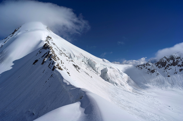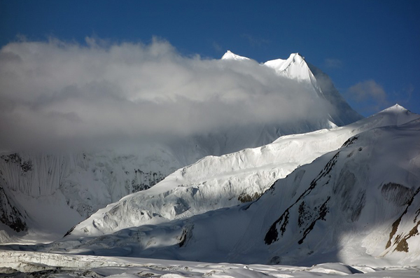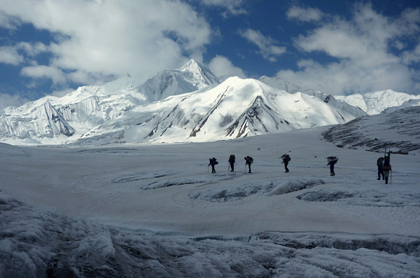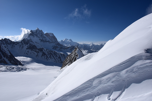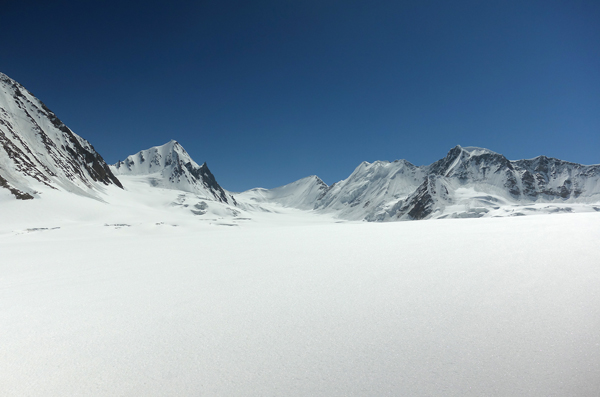 Der Talkessel vor dem eindrucksvoll verschneiten Bobishgir führt nach rechts in Richtung Lupke-Pass, den ich 2012 und 2016 überschreiten konnte. Wir gehen weiter linker Hand nach Süden und dann noch etwa 2 Stunden hinauf zu einem weiteren "no name" Gletscher, der dann nach Osten hinauf zu einem Einschnitt eines gewaltigen Gratverlaufs führt. Dies müsste nach meinen Berechnungen der Tilman-Pass sein.
