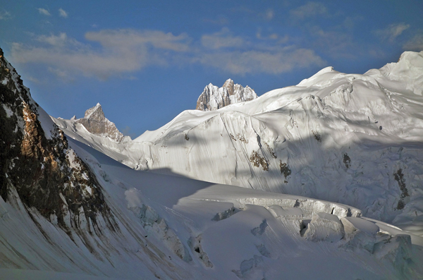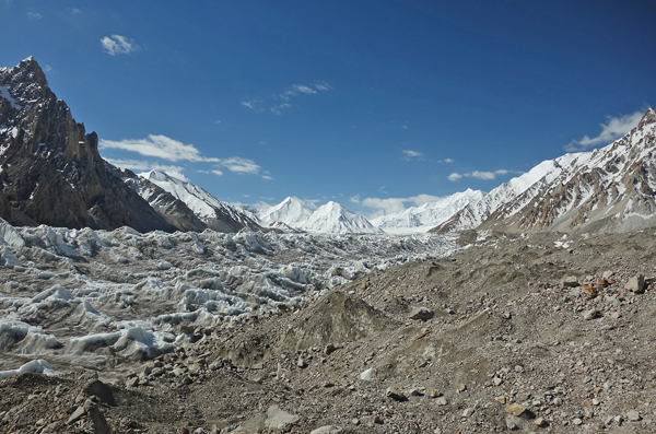 Von dort geht es dann in drei Tagen über den zerrissenen Braldo Gletscher - abwechselnd auf der Seitenmoräne und mittig - hinauf zu einem weiten nach Südosten offenen Gletscherkessel kurz vor dem Bobishgir Peak (6416m).