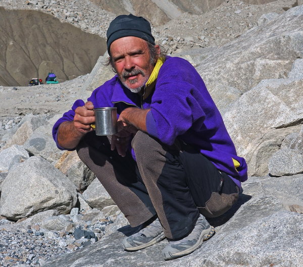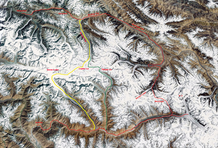 Die Entscheidung fällt mir nicht leicht: Der Weg zurück zum Braldu-Gletscher und über den Lupke-La hinunter auf den Sim-Gang-Gletscher, Snow-Lake und Biafo-Gletscher nach Askole ist bedeutend weiter. Doch den "verschollenen" Tilman-Pass - übrigens die Wasserscheide zwischen der indischen Tiefebene und Zentralasien - habe ich wieder entdeckt und er wird sicher in Zukunft eine interessante Variante sein, um den Karakorum zu überschreiten.