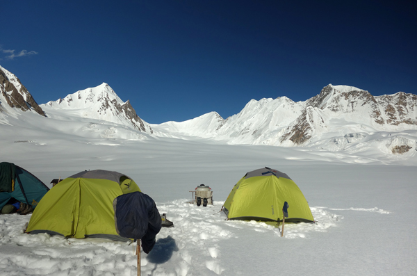 Ein weiteres Camp entsteht zunächst auf dem unbekannten Gletscher. Früh am des 3. Juli starten wir in der Dämmerung. Wir haben Glück: Der Himmel ist klar - die Kulisse perfekt! Im Süden taucht die Spitzen des Ogre (7285m) über einem vergletschertem Grat auf - ein magischer Anblick!