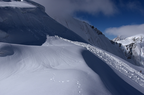 Der Anstieg zum Pass - gut vier Stunden - ist total vergletschert. Wir begehen zwei Passagen mit ca. 45°. Die Sonne brennt inzwischen in den Kessel und auf den letzten Aufschwüngen wird der Schnee schon weicher und schwerer. Ein paar kleinere Lawinen, die wir queren müssen, sind schon abgerutscht. Die letzten 200 Meter bis zum höchsten Punkt gehe ich alleine und genieße das Panorama. Unglaublich, wie viele unbekannte Gipfel vom Tilman-Pass zu sehen sind. Der Ausblick ist unvergleichlich. Der Karakorum: Das Gebirge meiner Träume! Der heutige Tag ist sicher ein absoluter Höhepunkt meiner vielen Exkursionen in diesem Teil der Welt. Die über Sattelitennavigation gemessene Höhe (sieben Sateliten) des Tilman-La: 5555 m.